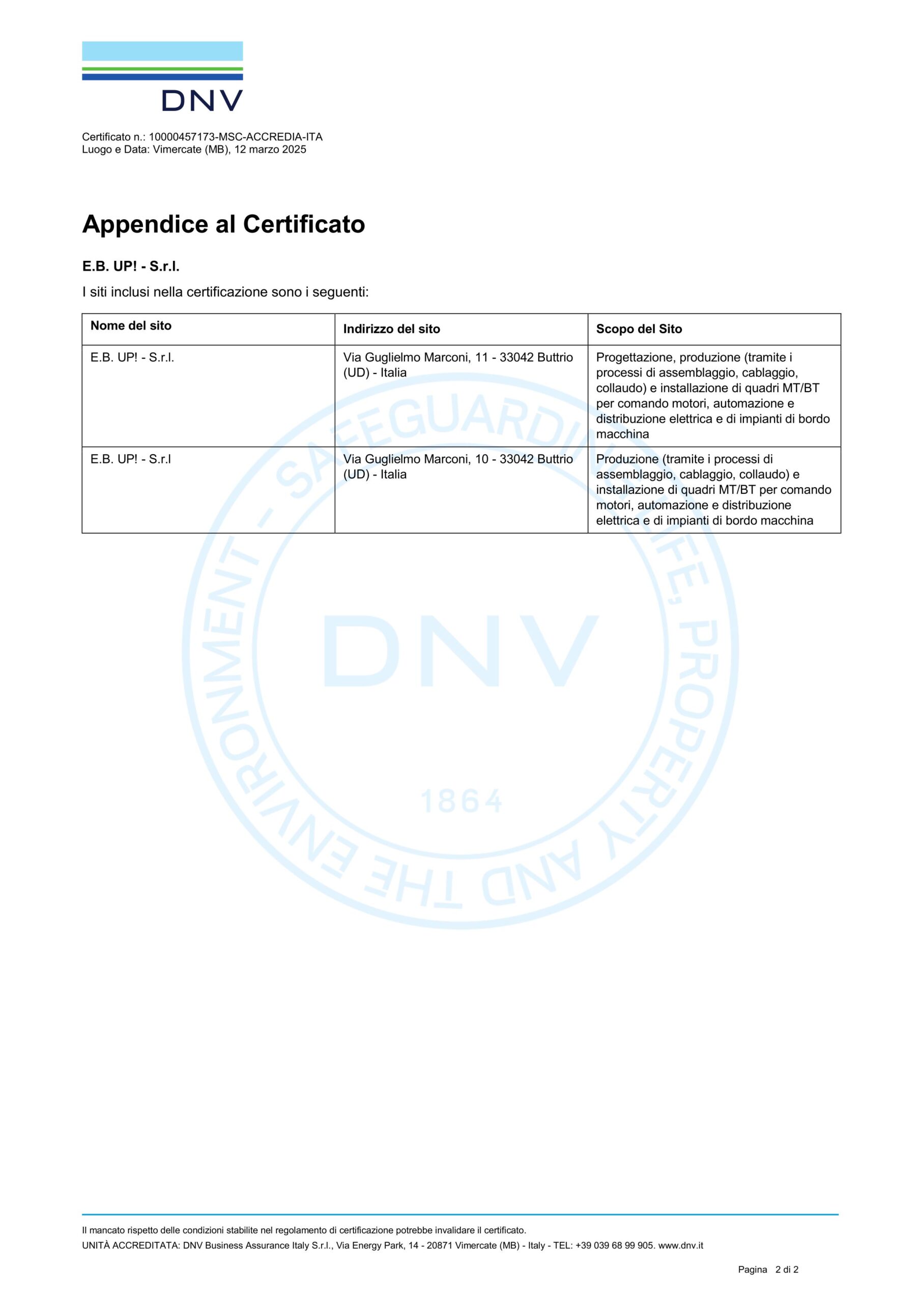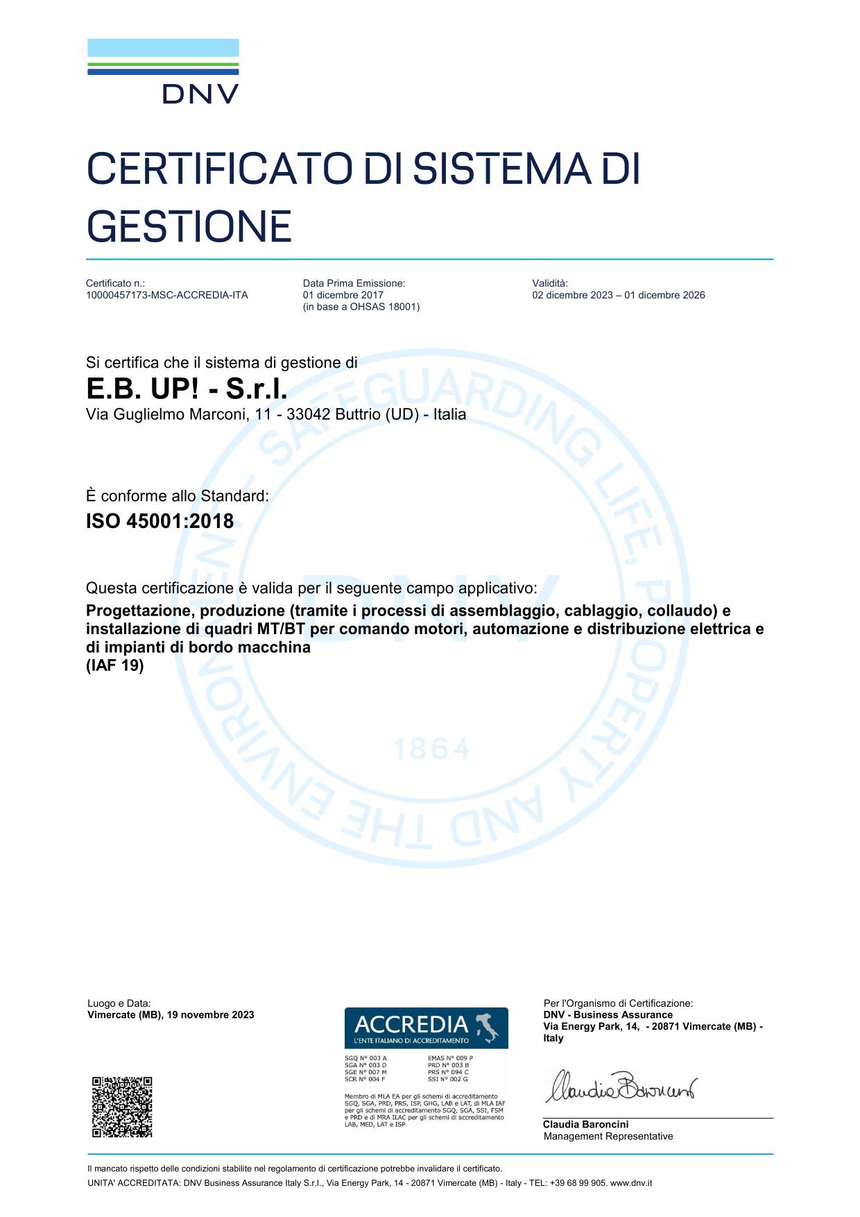 Il sistema è sorvegliato da DNV, Ente Terzo Indipendente che accerta e certifica la conformità dell’attività svolta rispetto alle norme UNI EN ISO 9001:2015 (Qualità dei prodotti e dei servizi) e UNI ISO 45001:2018 (Salute e Sicurezza sui luoghi di lavoro) verificandone sistematicamente la costante applicazione ed efficacia.