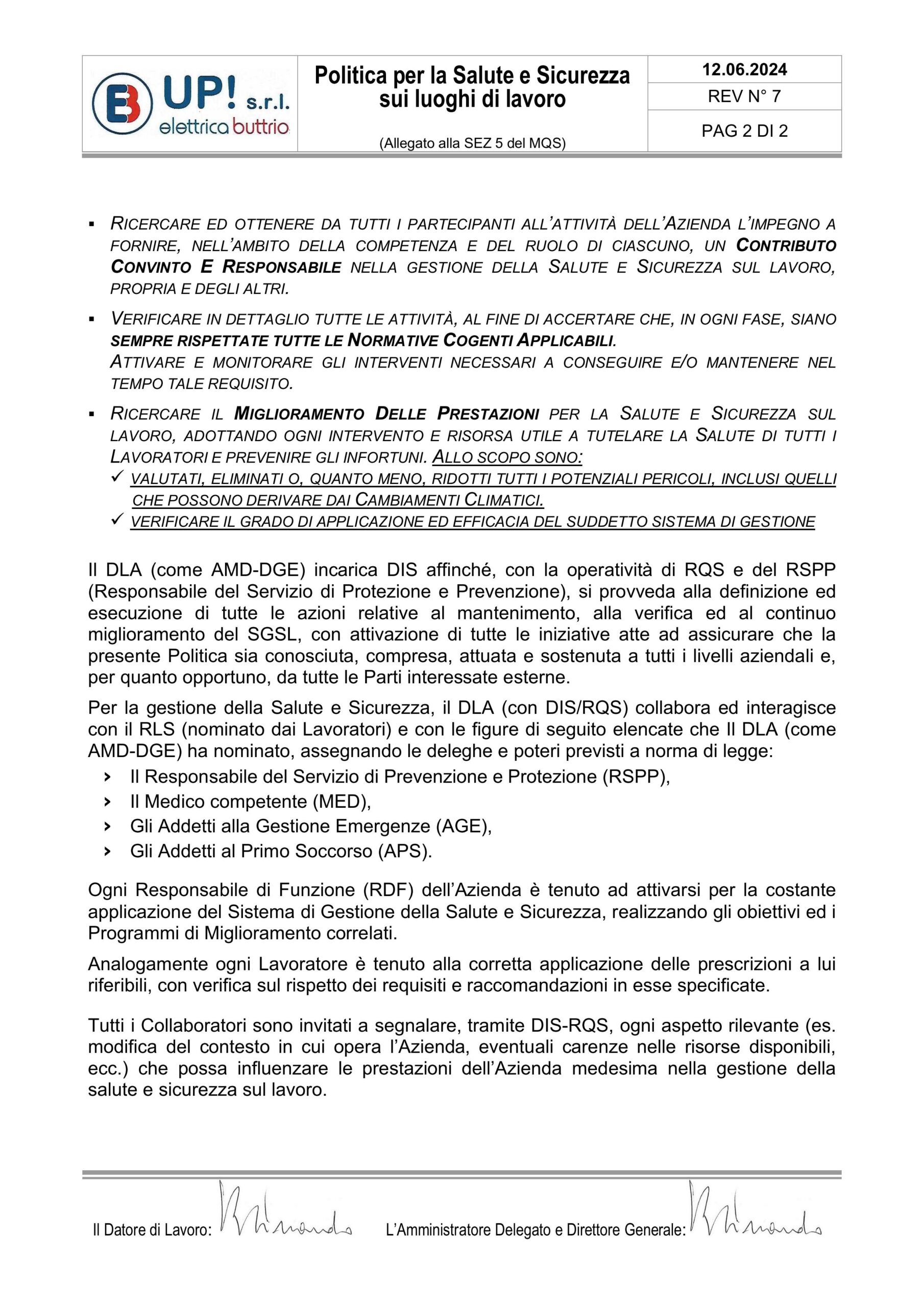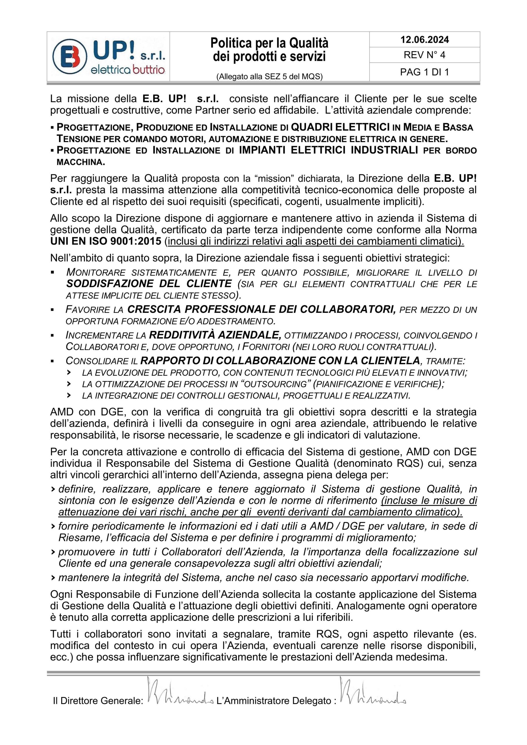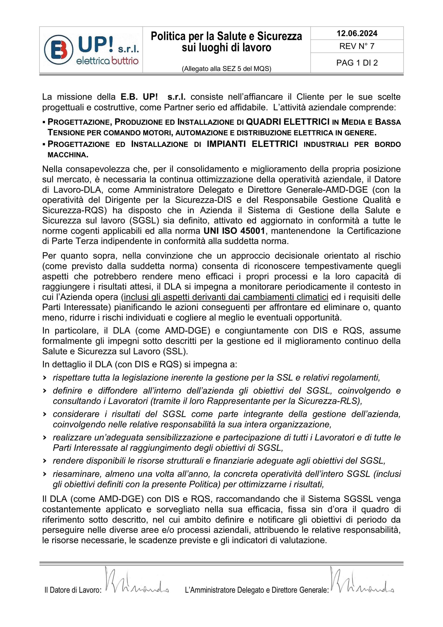 Le linee guida dell’Azienda per la missione, ed i valori essenziali, così come i principi d’azione e gli obbiettivi, sono definiti dalla Direzione aziendale, formalizzati nella Politica per la Qualità dei prodotti e servizi e per la Salute e Sicurezza sui luoghi di lavoro.