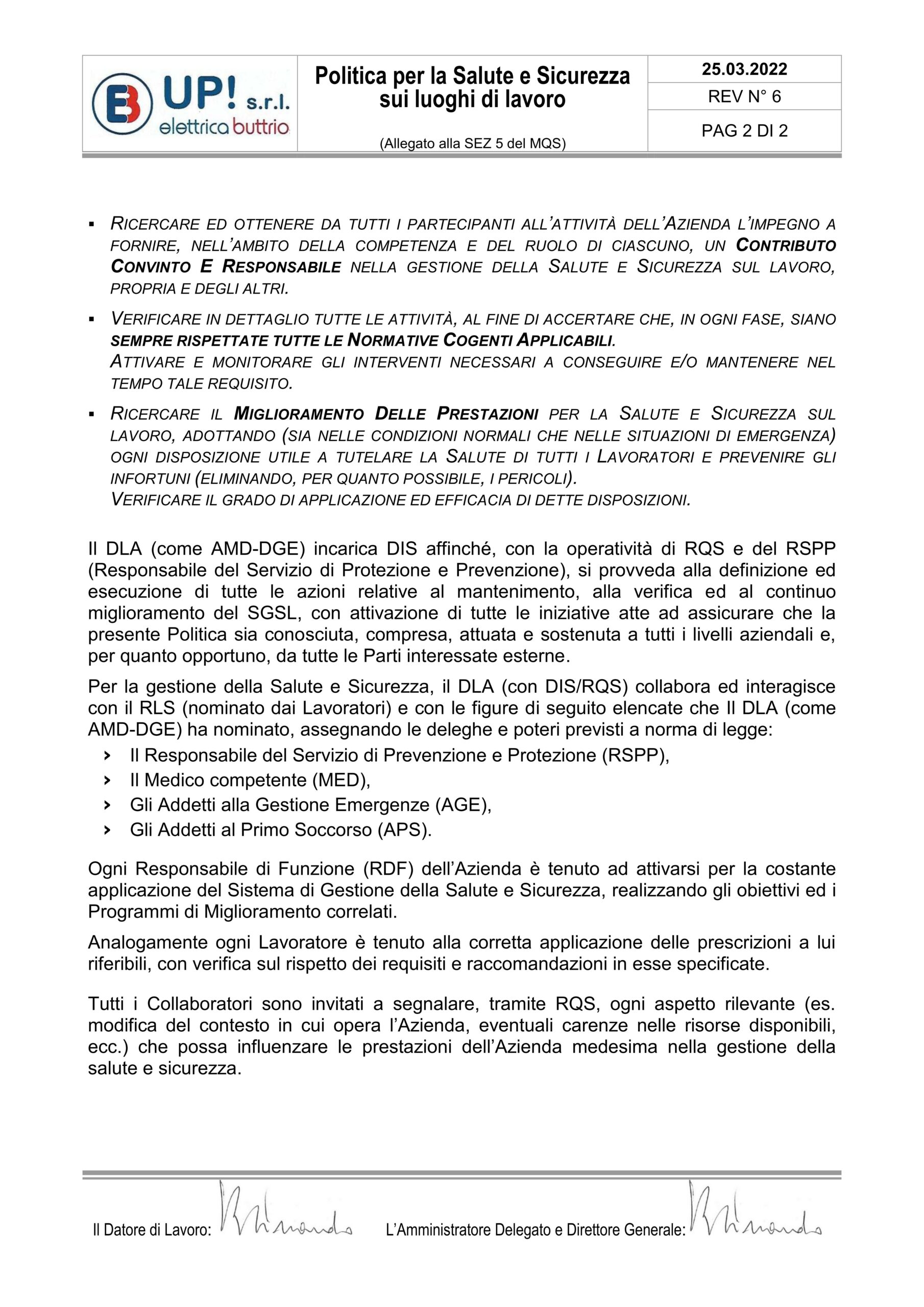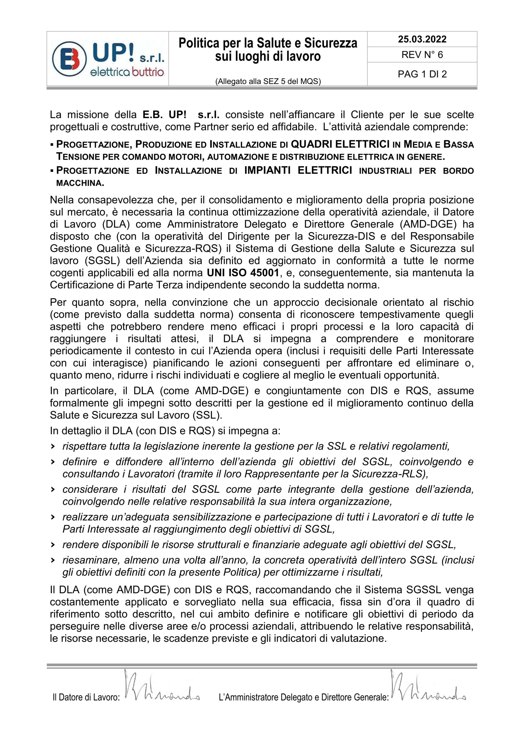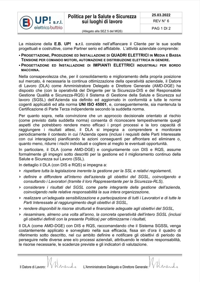 The corporate guidelines on the mission, and essential values, as well as the action principles and objectives, are defined by corporate management, formalised by the Quality Policy of the products and services for occupational Health and Safety.